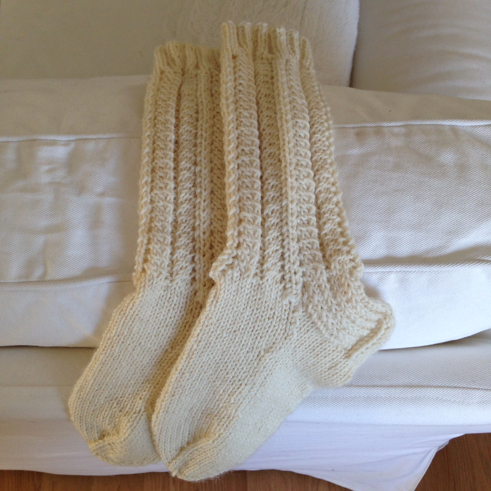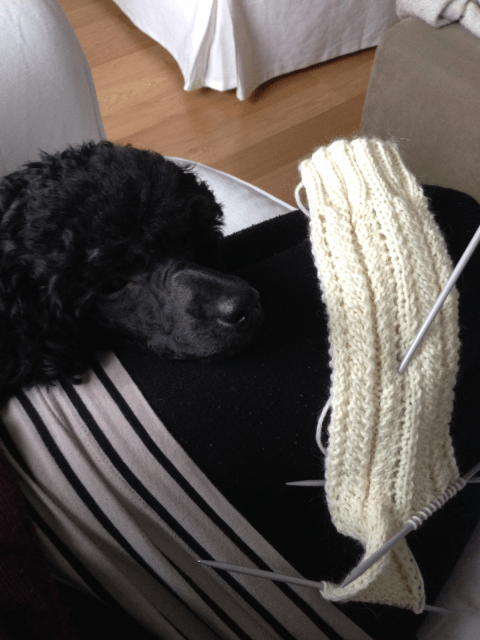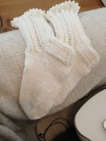 Harjoittelin aluksi yhtä sukanvartta ja kun hoksasin idean, pistin puikoille kaksi sukanvartta. Alussa homma oli kieltämättä sekavaa ja langat ja puikko oli sotkulla, mutta siitä se muutaman kerroksen jälkeen lähti sujumaan. Pyöröpuikoilla on miellyttävämpi neuloa kun kädet eivät väsy niin helposti.