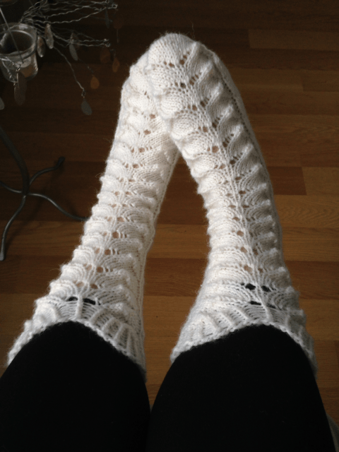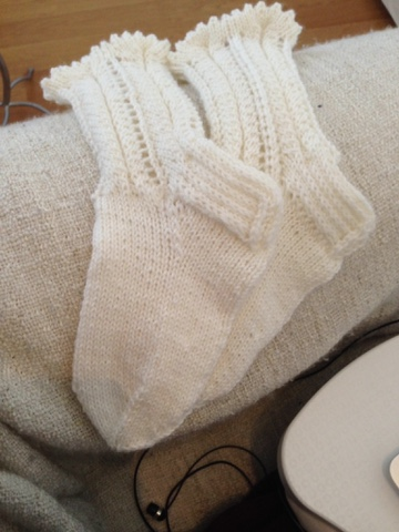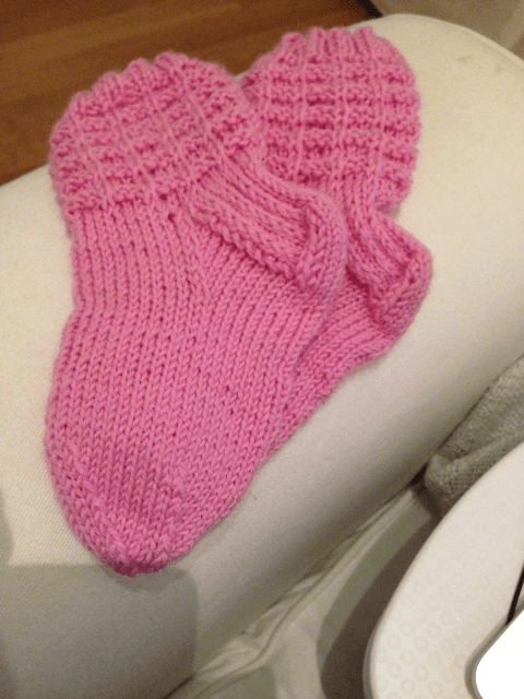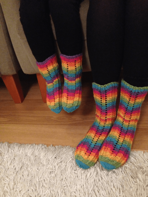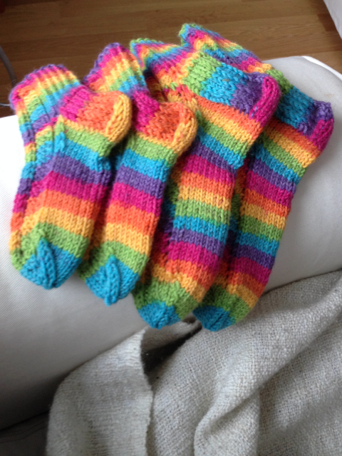 Tuossa pari postausta alempana on pojan lapaset, jotka tein näiden sukkien jälkeen pyöröpuikoilla yhtäaikaa. Olipa mukava, kun tiesi ihan varmasti, että peukalon lisäyksen ja kärjen kavennukset tulevat justiinsa samoilla kierroksilla.