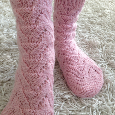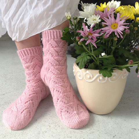 Ostin kesälomalukemiseksi Cookie A:n sukkia. rakkaudella. -kirjan. Siis kesälomatekemiseksi. Kirjassa on mielenkiintoisia sukkamalleja, joita varmasti tulee neuloskeltua. Ensimmäisenä puikoille pääsi Monkey-malli, tosin raa’asti muokatuna. Malli on kirjoitettu fingering-vahvuiselle langalle, mutta kun lankakoristani ei sellaisia löydy, muokkasin pitsikaaviota pienemmälle silmukkamäärälle. Kuvio ei siitä onneksi kärsinyt. Varren ja jalkaosan pituudestakin napsasin yhdet kuviokerrat pois. Kantapään käännös ja kärki ovat sentään tehty ohjeen mukaan. Ihan mukavat sukat tuli. Silmukoita varressa 58, jalkaosassa 54. Puikot 2.75 mm.