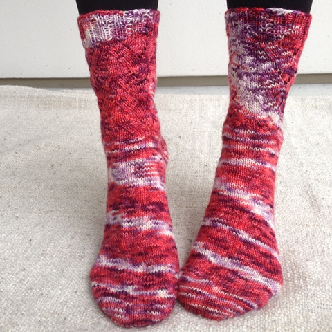 Käsistä karannut -blogin Tiinan suunnittelmat Villiviinisukat ovat aivan ihanat! Aluksi kehitin itselleni kynnyksen neuloa noin erikoisella tekniikalla, mutta sehän olikin helpompaa kuin kuvittelin. Toki neulomisessa auttoi hyvä ja perusteellinen ohje (saa ilmaiseksi Ravelrysta).