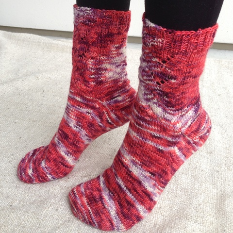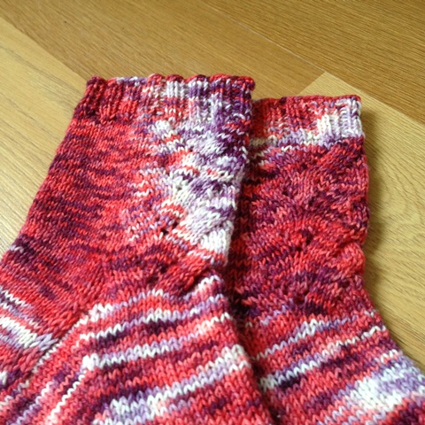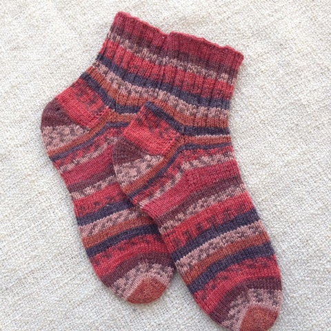 Aloin neuloa sukkiin pitsivartta, mutta eihän se tässä pätkävärjätyssä langassa näyttänyt kuin sotkulta. Perussukkaa sitten, värijuoksut sentään laitoin kohdalleen. En tykkää väreistä, mutta erinomainen lanka neuloa! Ihanan pehmeää, joustavaa ja neulepinnasta tulee tasainen. Lisäää arvosteluja Suuri Käsityö -lehden sivuilta.