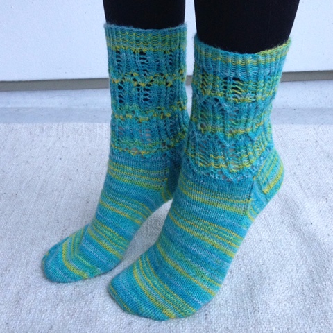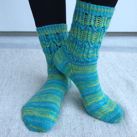 Tämäkin väri oudoksutti ensikatsomalta, mutta loppujen lopuksi oli testisetin nätein väri. Varteen pistelin pitsiä, mutta sukkaosan jätin sileäksi, jotta lanka pääsee oikeuksiinsa. Mukavat ohuet kenkäsukat tuli. Lisää arvosteluja langasta voit lukea Suuri Käsityö -lehden sivuilta.