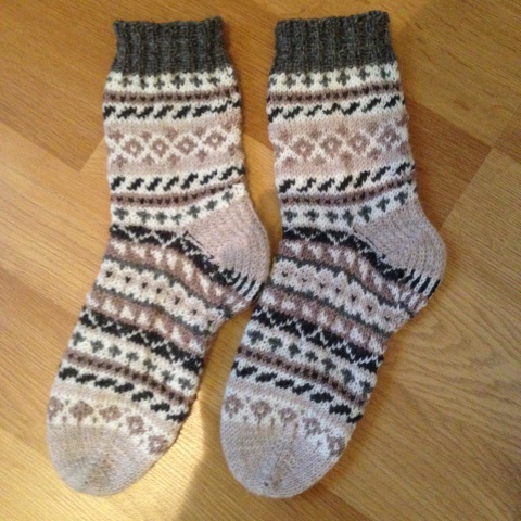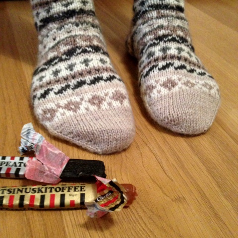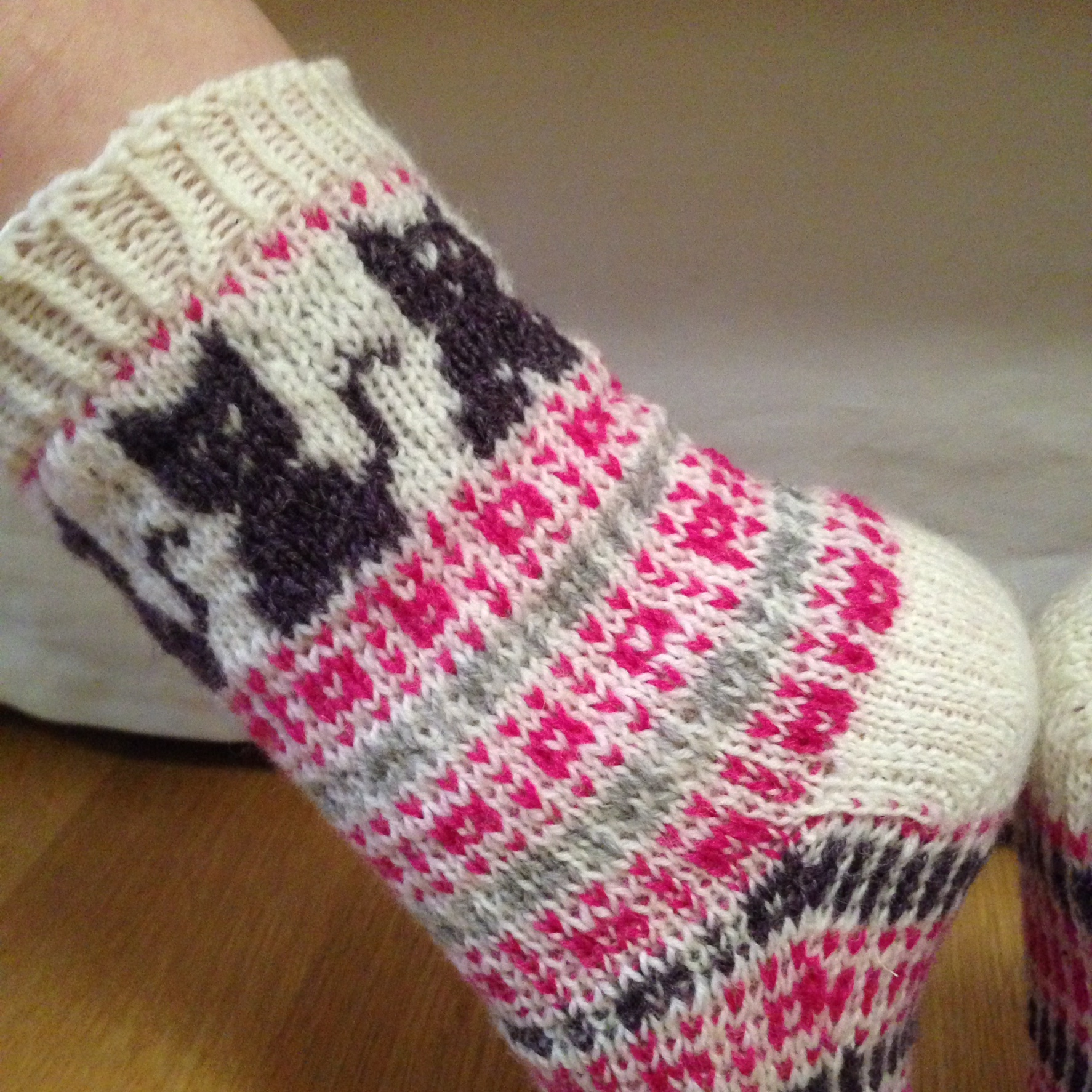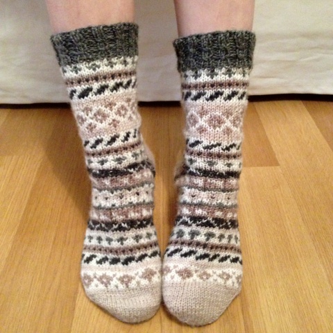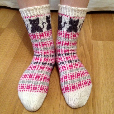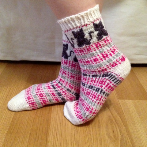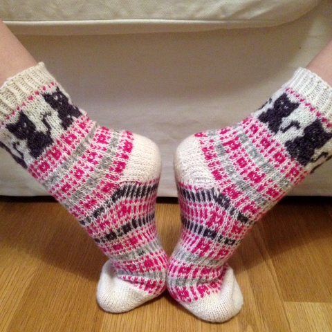 Tehtyäni aikaisemmin lapaset yksinkertaisella kirjoneuleella, halusin tehdä samalla kuviolla myös sukat. Jottei ihan olisi tylsäksi käynyt, lisäsin kirjoneulekissan sukkien varteen. Kissan silmiä ja suuta en saanut sievästi näkyviin, vaikka olin tarkkana dominanssin kanssa. Kyllä kai tuon kissaksi tunnistaa. Noin muutoin ison kirjoneulekuvion neulominen meni yllättäen kivuttomasti, vaikkakin hitaasti.