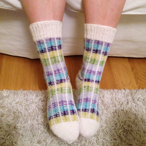 Osallistuin Tuin Kutomon Ravelryssä järjestämään minivyyhtivaihtoon, jossa Tuin arpomalle parille lähetettiin 10 kpl viiden gramman painoisia minivyyhtejä ja saatiin toiselta parilta itse samanmoinen lähetys. Useat neulovat tällä hetkellä suosittua Coziest Memory -peittoa ja tarvitsevat siihen pieniä lankanöttösiä. Itse en peiton neulomisesta ole (vielä) innostunut, mutta halusin vaihtelun vuoksi neuloa jämälankasukat ”vieraista” langoista. Kokeilu onnistui erinomaisesti: neulominen toisen jämistä oli jännittävää ja lopputulos mahtavan värikäs! Ihan ei lähetetyt jämät riittäneet, joten muutama raita on neulottu omista langanjämistä. Nämä eivät jää viimeiseksi minivaihtosukiksi, teen seuraavat heti kun jossakin tapahtuu vaihtoa!