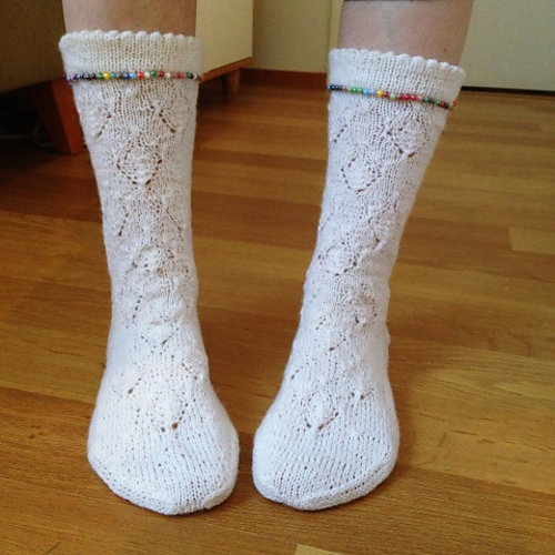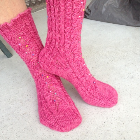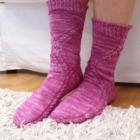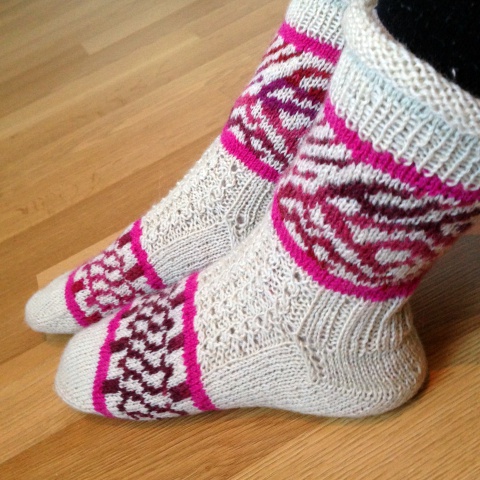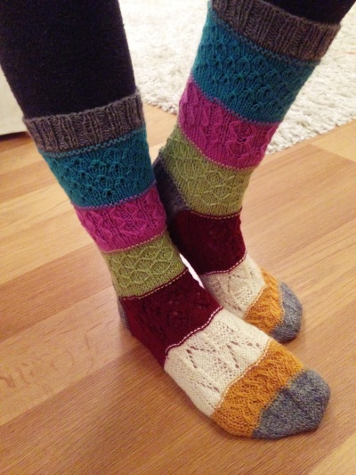 Osallistuin Tuin Kutomon Ravelryssä järjestämään minivyyhtivaihtoon, jossa Tuin arpomalle parille lähetettiin 10 kpl viiden gramman painoisia minivyyhtejä ja saatiin toiselta parilta itse samanmoinen lähetys. Useat neulovat tällä hetkellä suosittua Coziest Memory -peittoa ja tarvitsevat siihen pieniä lankanöttösiä. Itse en peiton neulomisesta ole (vielä) innostunut, mutta halusin vaihtelun vuoksi neuloa jämälankasukat ”vieraista” langoista. Kokeilu onnistui erinomaisesti: neulominen toisen jämistä oli jännittävää ja lopputulos mahtavan värikäs! Ihan ei lähetetyt jämät riittäneet, joten muutama raita on neulottu omista langanjämistä. Nämä eivät jää viimeiseksi minivaihtosukiksi, teen seuraavat heti kun jossakin tapahtuu vaihtoa!