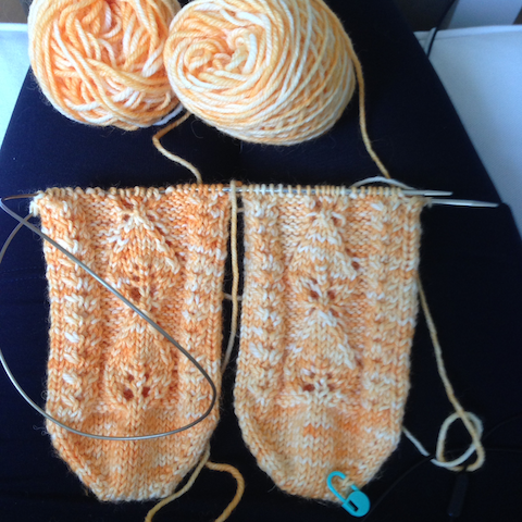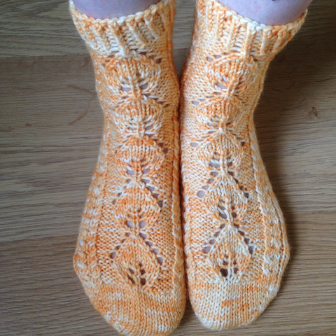 Yritin värjätä luonnonvalkoista lankaa (tumman) oranssiksi, mutta lopputuloksena oli appelsiinin keltainen. Epätasaikseksikin värjäys jäi, joten toinen sukka on toista tummempi. Syynä epäonnistumiseen oli liian vähäinen määrä punaista keltaisen värijauheen lisänä ja lankaakin liian paljon (100 g). Vielä värjäysastiassa väri näytti hyvältä, mutta langan kuivuttua totuus kävi ilmi. Neuloin kuitenkin sukiksi asti. Jos eriparisuus häiritsee liikaa, värjään sukat uudestaan 😉