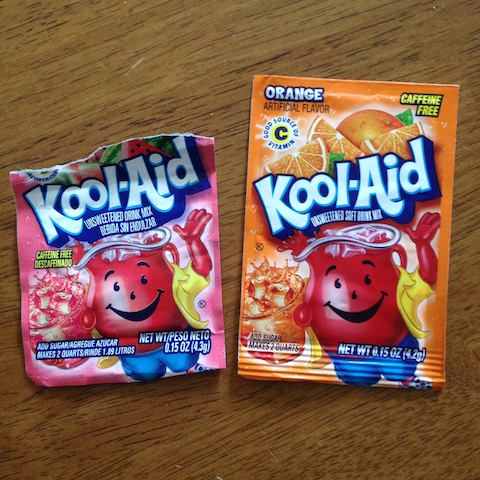 Kool-Aid värejä: punainen, pinkki, sininen ja Mango
