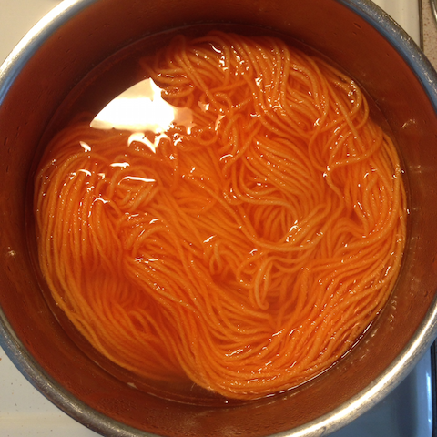 Lankoina oli valkoisia ja luonnonvalkoisia kerän loppuja. Aluksi langat vyyhditettiin ja kasteltiin kauttaaltaan kädenlämpöisessa vedessä. Sen aikana tehtiin pieniin kulhoihin väreistä ja vesitilkasta halutut väriyhdistelmät. Sitten vyyhdit laakeaan vatiin ja teelusikalla väriä haluttuihin osioihin. Sen jälkeen vyyhti mikroon muutamaksi minuutiksi. Lopuksi huuhtelu ja kuivaus. Kuivunut lankavyyhti sitten kerälle (prosessin tympein osuus).