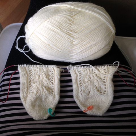 Teen lisäykset 3 x joka kierroksella ja sen jälkeen joka toisella kierroksella niin kauan, että minulla on haluttu kokonaismäärä silmukoita. Nyt onkin sukan kärki valmis ja jatketaan sukkaosan neulomista.