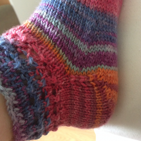 Päivitys: kantapään jälkeen, kun lähdetään neulomaan sukan vartta, saattaa helposti jäädä reikä puikkojen vaihtokohtaan. Sen voi estää nostamalla vaihtokohdasta silmukan vasemmalle puikolle ja neulomalla sen yhteen edellisen silmukan kanssa. Ja tuon voi tehdä vielä toisellakin kierroksella, jos näyttää reikää muodotuvan.