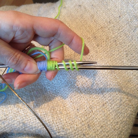 Tällä tekniikallahan voi neuloa myös yhtä sukkaa kerrallaan ja siitä minun mielestäni kannattaakin aloittaa, jos ei ole ennen kokeillut kärjestä aloitettua, pyöröpuikoilla neulottua sukkaa. Neulon edelleen yhtä sukkaa kerrallaan, kun työssä on enemmän kuin yksi väri. Hermoni eivät kestä sitä lankojen selvittelyä, joka väistämättä on jossakin vaiheessa edessä, jos työssä on enemmän kuin kaksi lankakerää kiinni. On erilaisia tekniikoita, joilla lankojen pitäisi pysyä järjestyksessä, mutta omalla kohdallani ne eivät ole toimineet tarpeeksi hyvin 😉