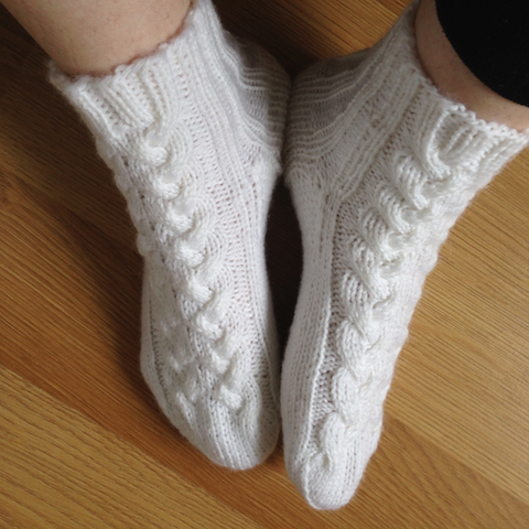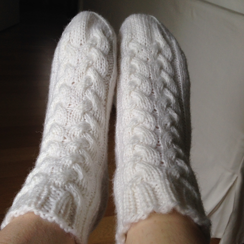 Yritin värjätä luonnonvalkoista lankaa (tumman) oranssiksi, mutta lopputuloksena oli appelsiinin keltainen. Epätasaikseksikin värjäys jäi, joten toinen sukka on toista tummempi. Syynä epäonnistumiseen oli liian vähäinen määrä punaista keltaisen värijauheen lisänä ja lankaakin liian paljon (100 g). Vielä värjäysastiassa väri näytti hyvältä, mutta langan kuivuttua totuus kävi ilmi. Neuloin kuitenkin sukiksi asti. Jos eriparisuus häiritsee liikaa, värjään sukat uudestaan 😉